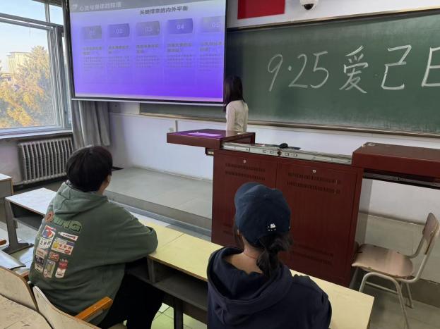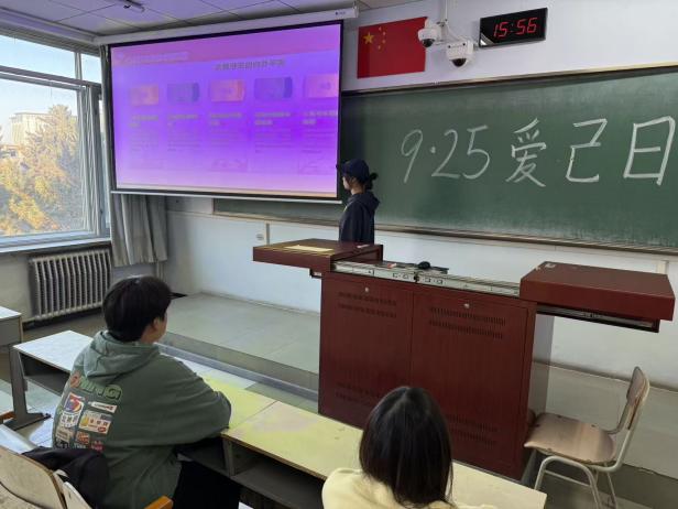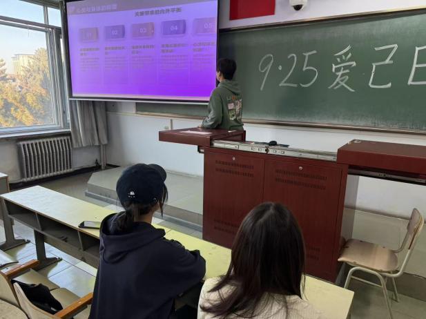 心育部的同学们化身倾听者与记录者,带着对“爱自己”的思考深入同学之间。他们用提问打开对话的窗口,从“如何与自己的不完美和解”到“哪些瞬间让你感受到自我接纳的力量”,在一次次轻松的交流中,收集到许多鲜活而真挚的心得。同时,制作的PPT展示环节也吸引了众多同学驻足,从“关注情绪的合理宣泄”到“建立健康的生活节奏”,再到“学会拒绝与自我肯定”,一张张幻灯片,将抽象的“爱己”理念转化为具体可操作的方法,为同学们提供了清晰的行动指引。