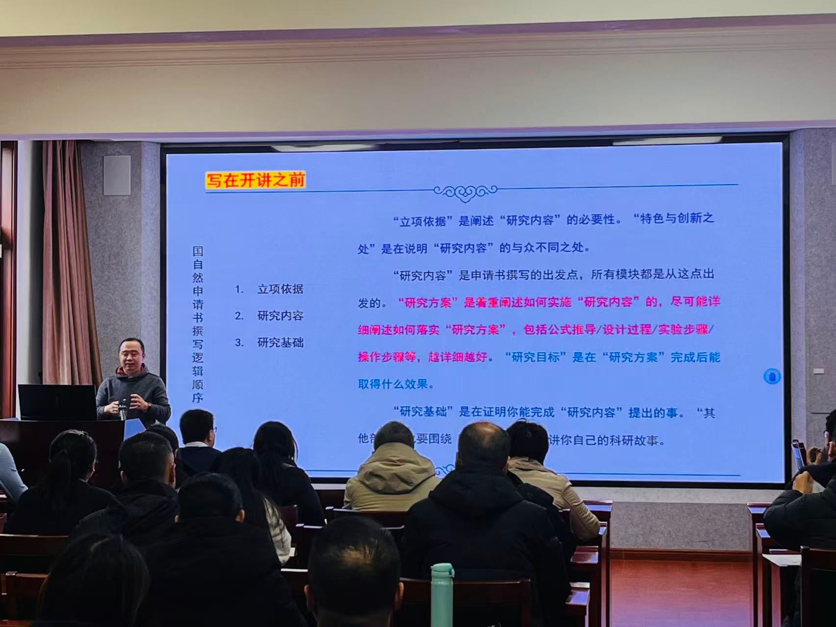 2026年国家自然科学基金申报工作已进入关键筹备阶段,为积极响应基金委“瘦身提质”的改革要求,帮助我院教师精准把握最新申报政策导向,破解申请书撰写中的重点难点问题,提升申报质量与资助命中率,我院于2026年1月8日-9日举办2026年国家自然科学基金申报工作启动暨专题培训讲座。特邀中国科学院水利部水土保持研究所王文龙教授、内蒙古科技大学曹芙波教授作专题讲座。会议由李昊院长主持,全体专任教师及实验人员参加。