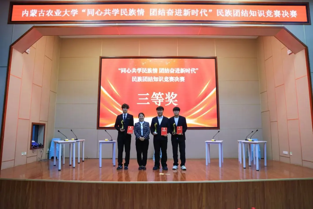 9月25日,内蒙古农业大学“同心共学民族情 团结奋进新时代”民族团结知识竞赛决赛在西区8号教研楼报告厅拉开帷幕。由23道桥2班胡凯淇、23道桥4班刘浩、23森工1班于浩东同学组成的代表队依靠丰富的知识储备、良好的团队配合和沉稳的临场表现,从激烈的竞争中脱颖而出,最终荣获三等奖。